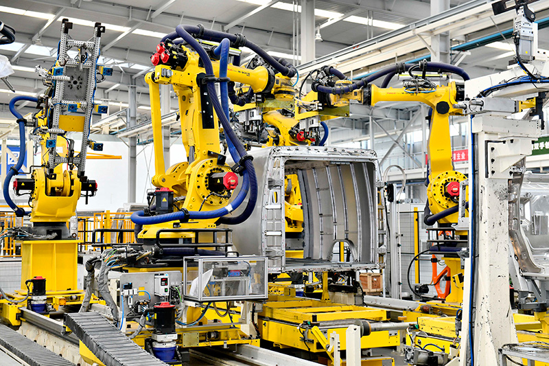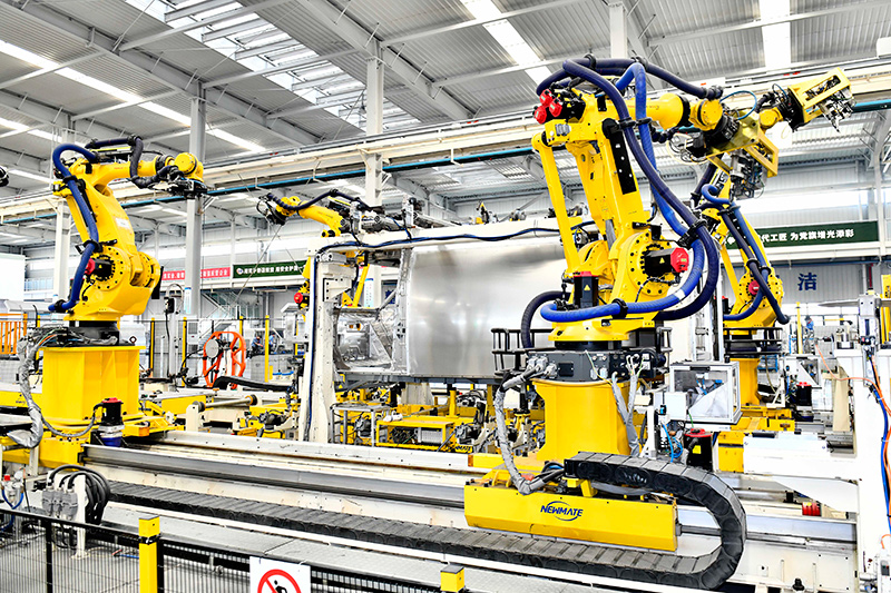 9月13日,在山东邹平魏桥轻量化基地宏奥全铝车身集成生产车间,工业机器人在流水线上作业。