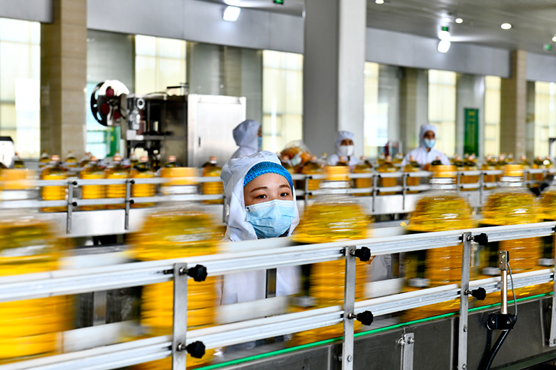 9月13日,在长寿花食品股份有限公司玉米油生产线,工作人员在流水线上作业。