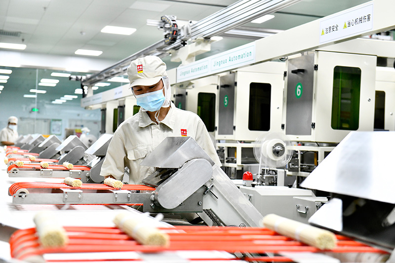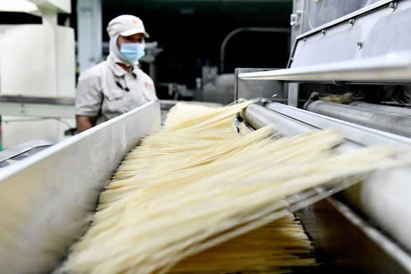 9月12日,在滨州中裕食品有限公司挂面生产车间,工作人员在流水线上值守。