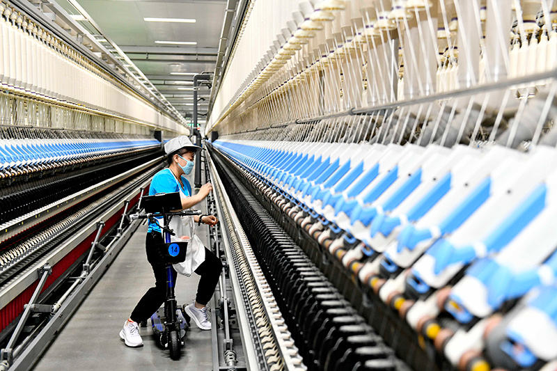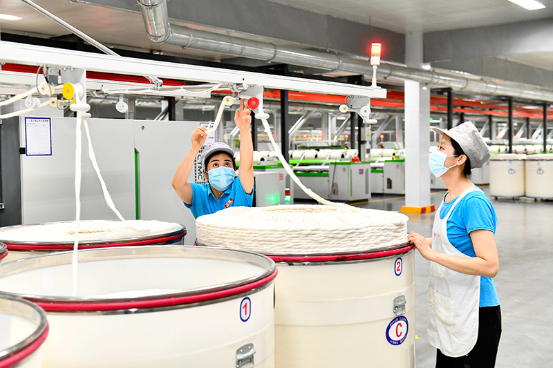 9月13日,在山东宏儒纺织科技有限公司绿色智能化生产车间,工作人员在加工高端纱线。