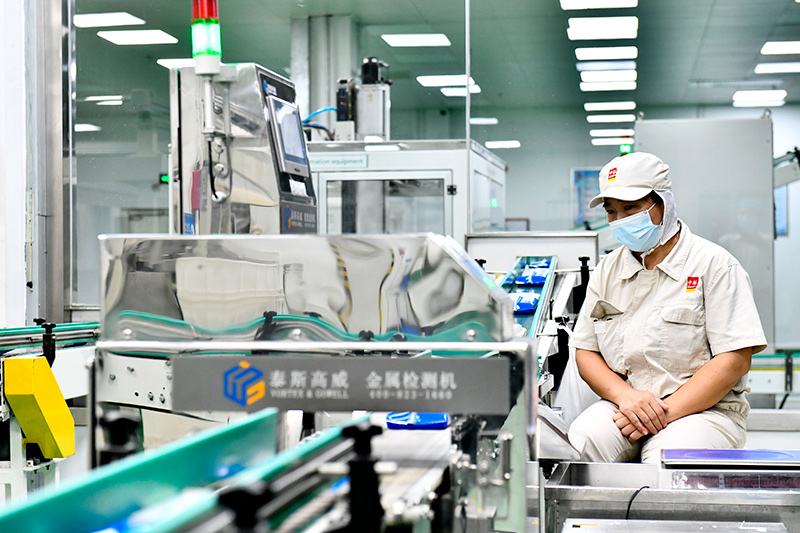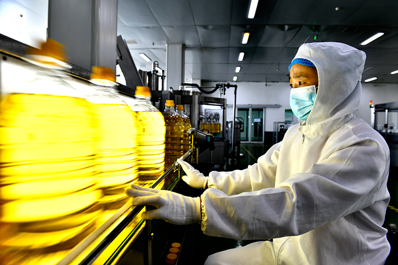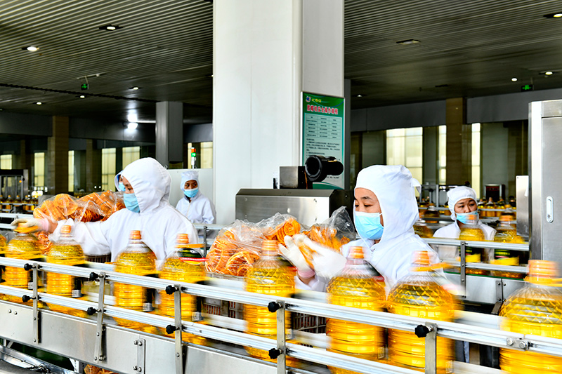 9月13日,在长寿花食品股份有限公司玉米油生产线,工作人员在流水线上作业。