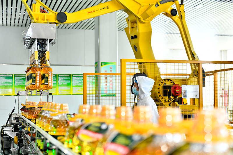 9月13日,在长寿花食品股份有限公司,工业机器人在抓取玉米油。