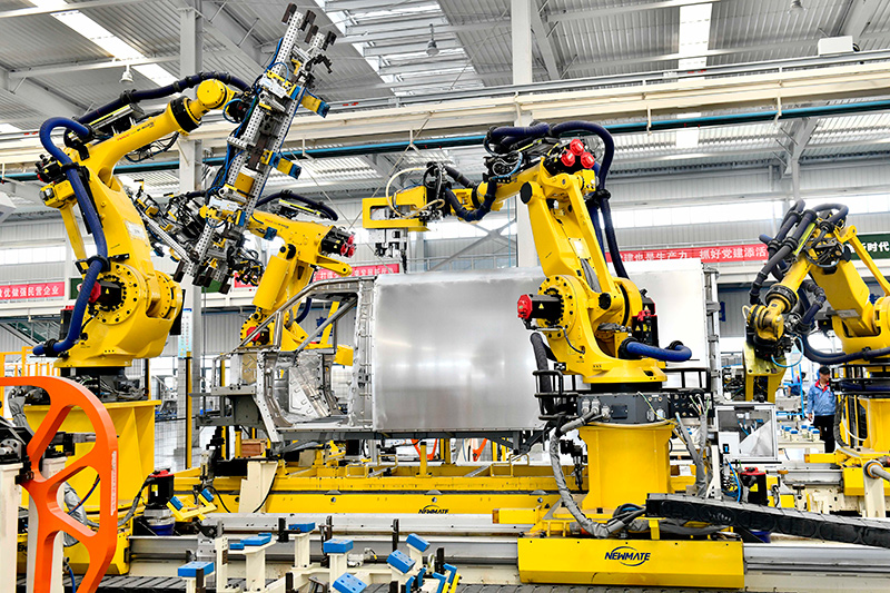 9月13日,在山东邹平魏桥轻量化基地宏奥全铝车身集成生产车间,工业机器人在流水线上作业。