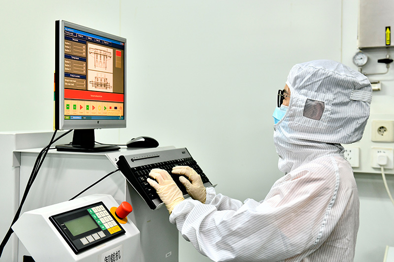 9月13日,在山东昊润自动化技术有限公司压力传感器生产车间,工作人员在设备前值守。