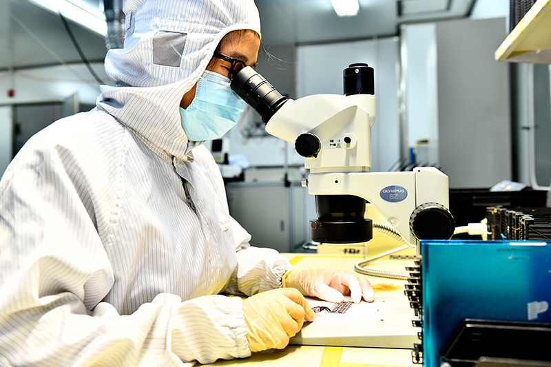 9月13日,在山东昊润自动化技术有限公司压力传感器生产车间,工作人员在检测传感器质量。